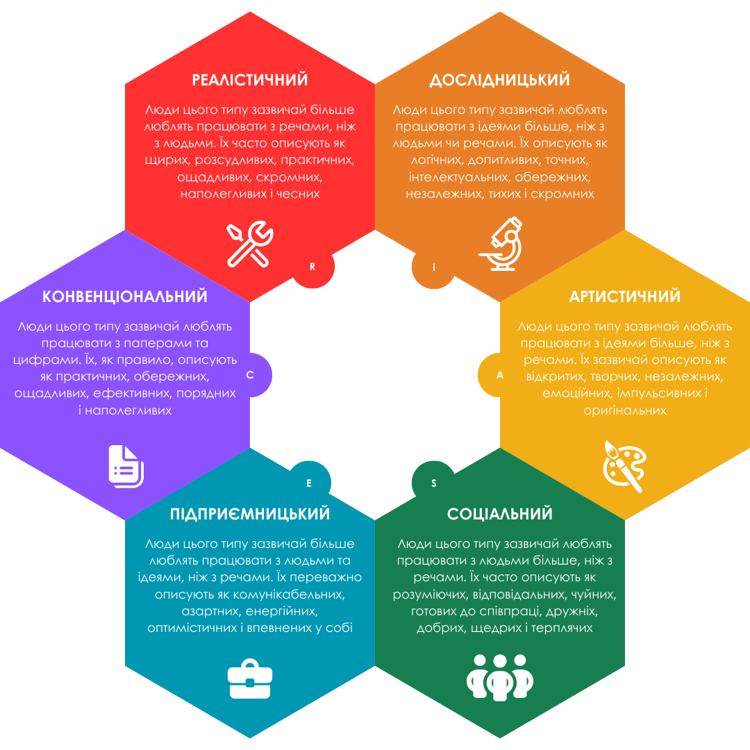 Відповідно до моделі Голланду (RIASEC), існує шість типів особистості, кожному з яких відповідає певний тип діяльності та певний вид професійного середовища. Якщо людина обирає професію та середовище, що відповідає своєму типу, вона буде працювати максимально ефективно, зможе досягти визначних успіхів та отримати найбільше задоволення від роботи.