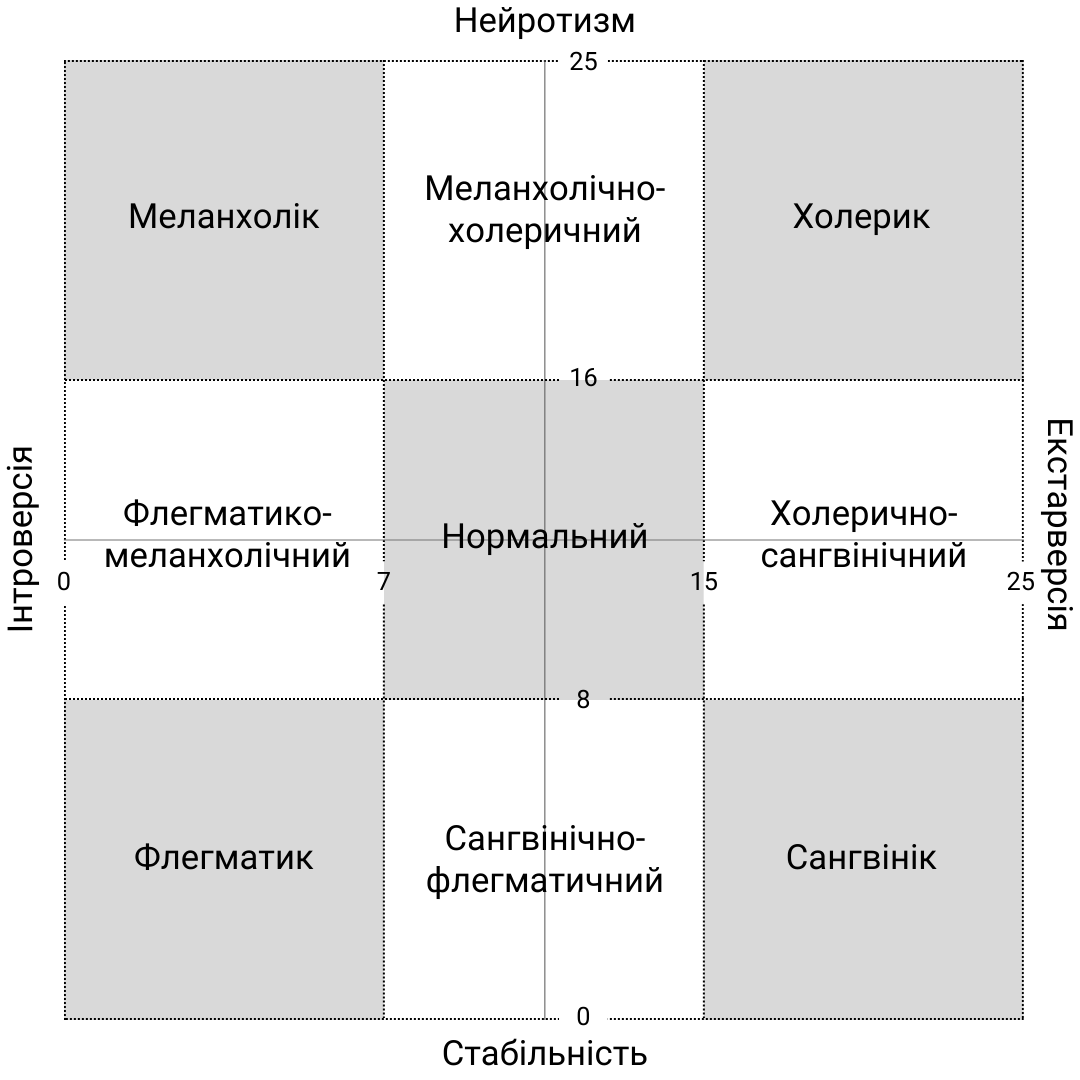 Таким чином, використовуючи дані обстеження за шкалами екстраверсії, інтроверсії та нейротизму, можна вивести показники темпераменту особистості за класифікацією Павлова, який описав чотири класичні типи: сангвінік (за основними властивостями центральної нервової системи характеризується як сильний, врівноважений, рухливий), холерик (неврівноважений, рухливий), флегматик (сильний, врівноважений, інертний), меланхолік (слабкий, неврівноважений, інертний).